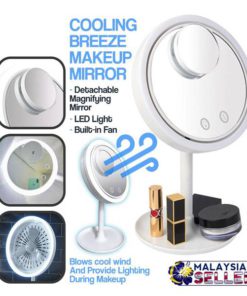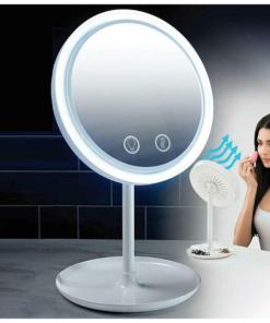 بتتشحن بال USB وبيجي معاها السلك، المراية الكبيرة فيها 2 زرار بتدوسي عليهم بخاصية اللمس، واحد بيشغل الضوء وواحد بيشغل المروحة, المراية الكبيرة بتقدري تحركيها بزاوية 180 درجة عشان تختاري الوضع اللي تحبيه، كمان فيه قاعدة بتثبتي فيها المراية والقاعدة دي فيها مكان عشان تحطي الميكب بتاعك وانتي بتحطي او الاكسسوار اللي هتلبسيه بكل سهولة وجمال، ابعاده 34 سم في 20 سم.