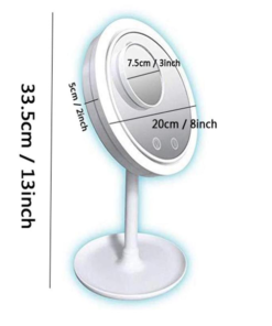 بتتشحن بال USB وبيجي معاها السلك، المراية الكبيرة فيها 2 زرار بتدوسي عليهم بخاصية اللمس، واحد بيشغل الضوء وواحد بيشغل المروحة, المراية الكبيرة بتقدري تحركيها بزاوية 180 درجة عشان تختاري الوضع اللي تحبيه، كمان فيه قاعدة بتثبتي فيها المراية والقاعدة دي فيها مكان عشان تحطي الميكب بتاعك وانتي بتحطي او الاكسسوار اللي هتلبسيه بكل سهولة وجمال، ابعاده 34 سم في 20 سم.